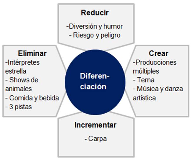 El ejemplo de Cirque du Soleil muestra cómo se puede lograr una gran diferenciación, sin tener que necesariamente incrementar los costes, en un negocio tradicional que parece tener pocas opciones de innovación. También sirve para ilustrar que una diferenciación exitosa se logra no solo agregando atributos sino, muchas veces, quitando atributos que ya no son tan relevantes para los consumidores.
