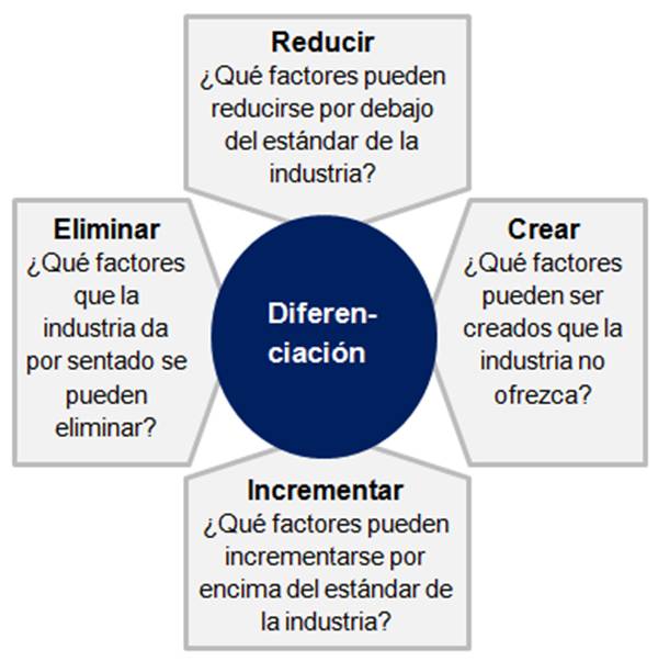 Sin embargo hay un modelo que es bueno conocer y que ayudará cualquiera sea el método elegido. Se trata de un modelo desarrollado por W. Chan Kim y Renée Mauborgne, ambos profesores de INSEAD, que tiene como objetivo desarrollar elementos que permitan diferenciar un producto o servicio de manera tal que la empresa compita en un espacio vacío, lo que ellos llaman un “océano azul” libre de competidores (8).