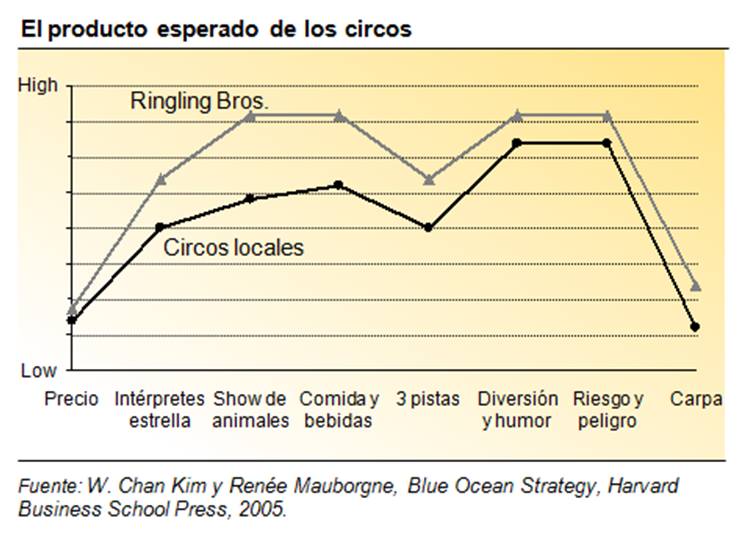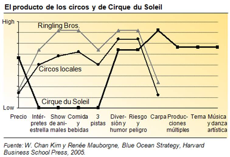 En una categoría madura, con ingresos en declive, Cirque du Soleil identificó los 7 atributos que establecía la competencia entre los circos: shows de animales, intérpretes o artistas estrella, shows múltiples en 3 pistas, diversión y humor, riesgo y peligro, la venta de bebidas y comida y la carpa. El gran líder Ringling se diferenciaba en esos atributos de los circos locales pudiendo cobrar a cambio un precio mayor.
